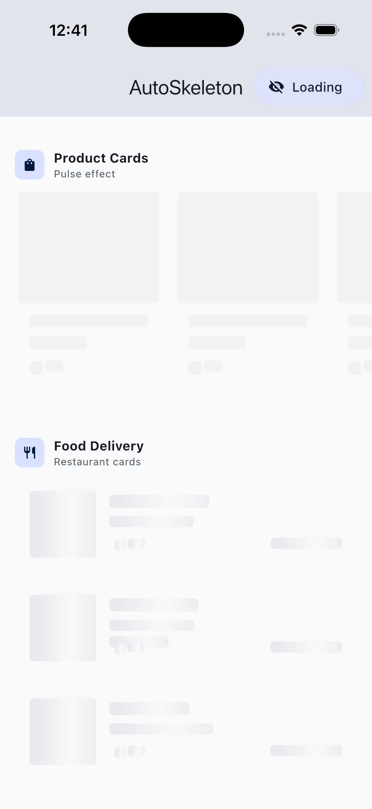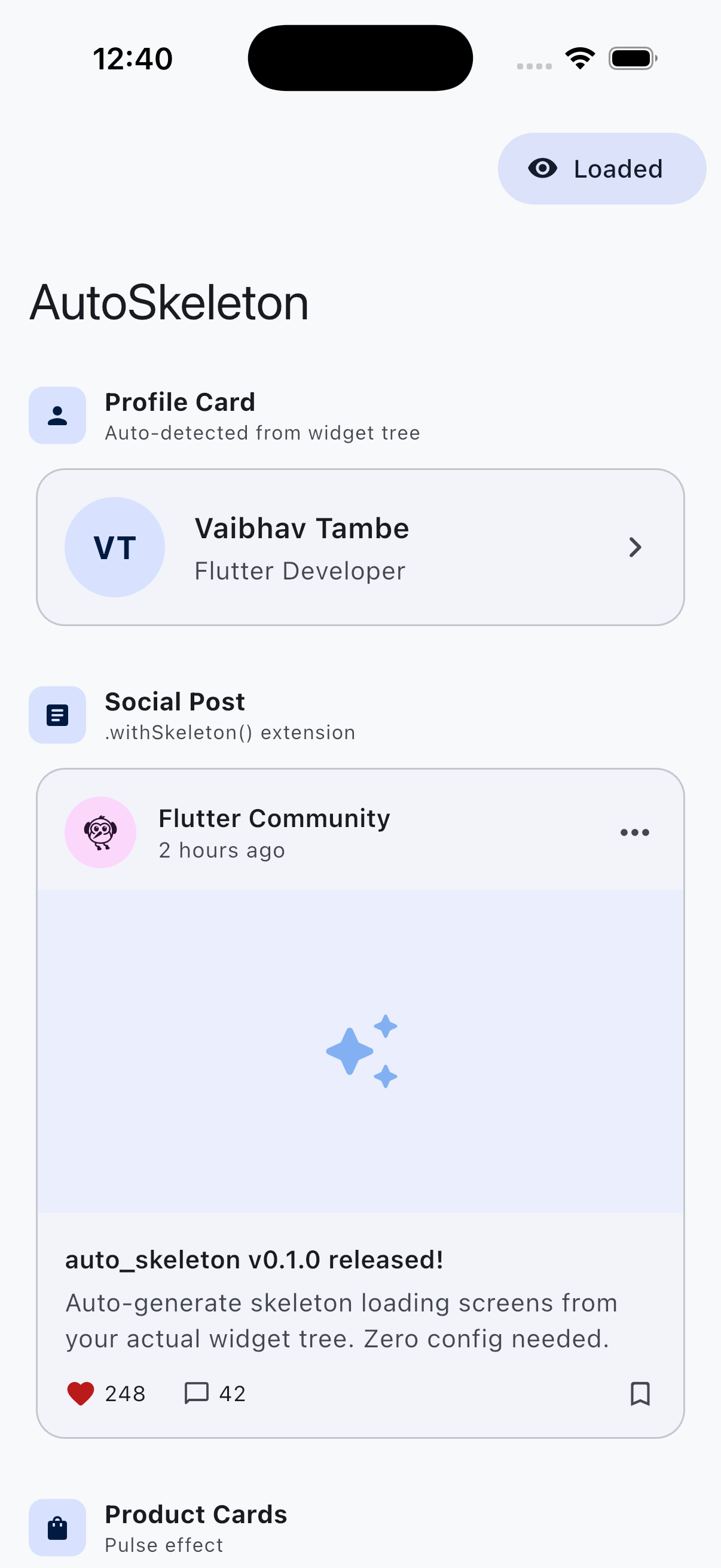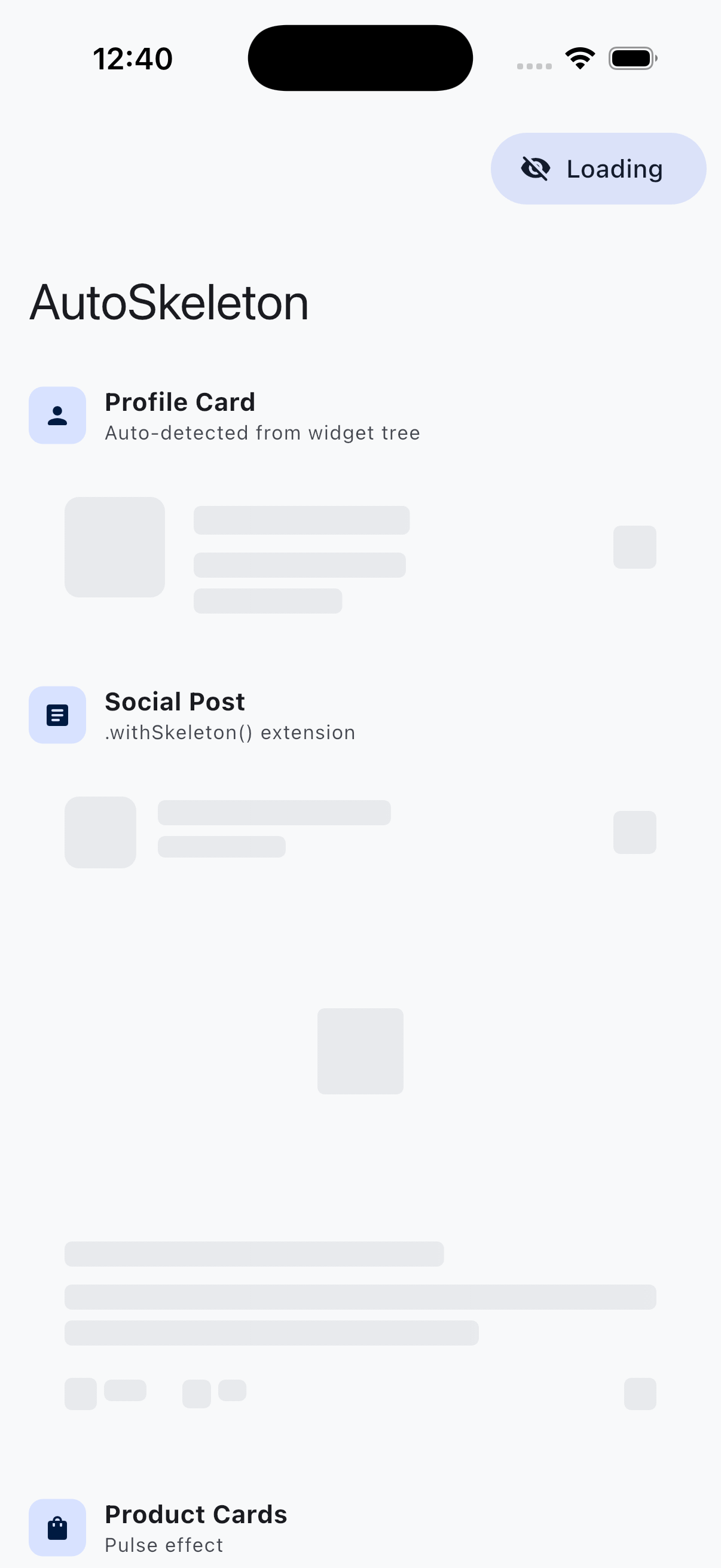 Auto-generate skeleton/shimmer loading screens from your actual widget tree. No fake data needed — just wrap your widget and get a matching placeholder shape automatically.
