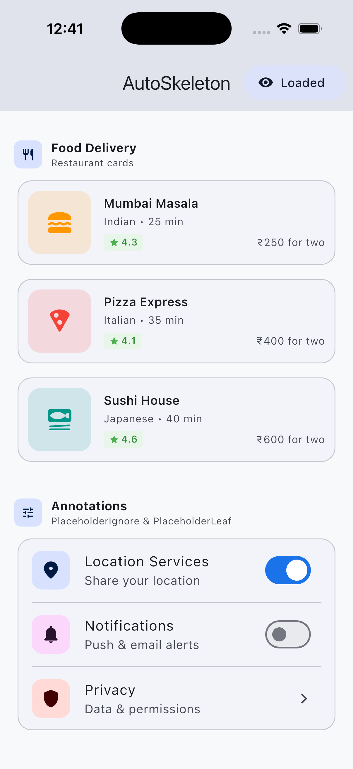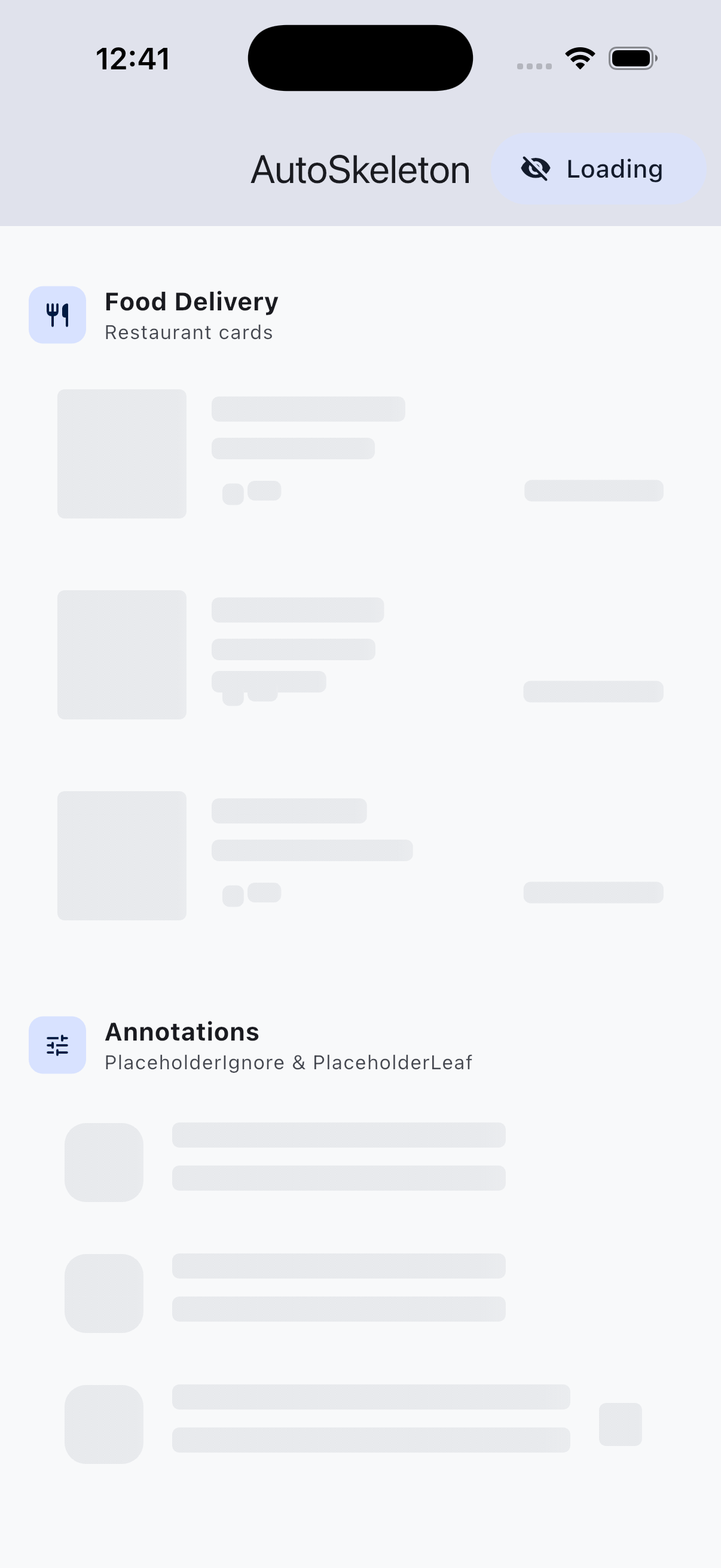 PlaceholderIgnore— the toggle switches are hidden during loading (not relevant to skeleton)PlaceholderLeaf— the colored icon boxes are treated as solid rectangles (no child traversal)
