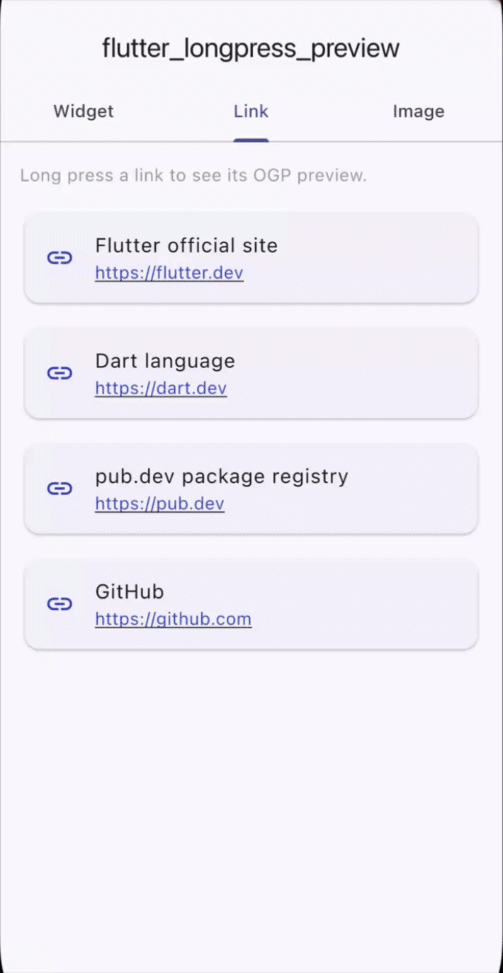 A Flutter package that shows a preview popup on long press, inspired by Safari's link preview and Instagram's peek feature. Supports any widget, automatic URL/OGP link previews, and zoomable image previews — with smooth animations, blur backdrop, and drag-to-dismiss.
