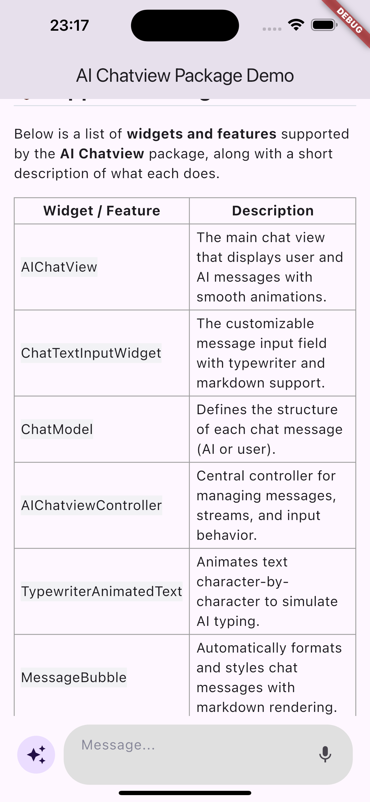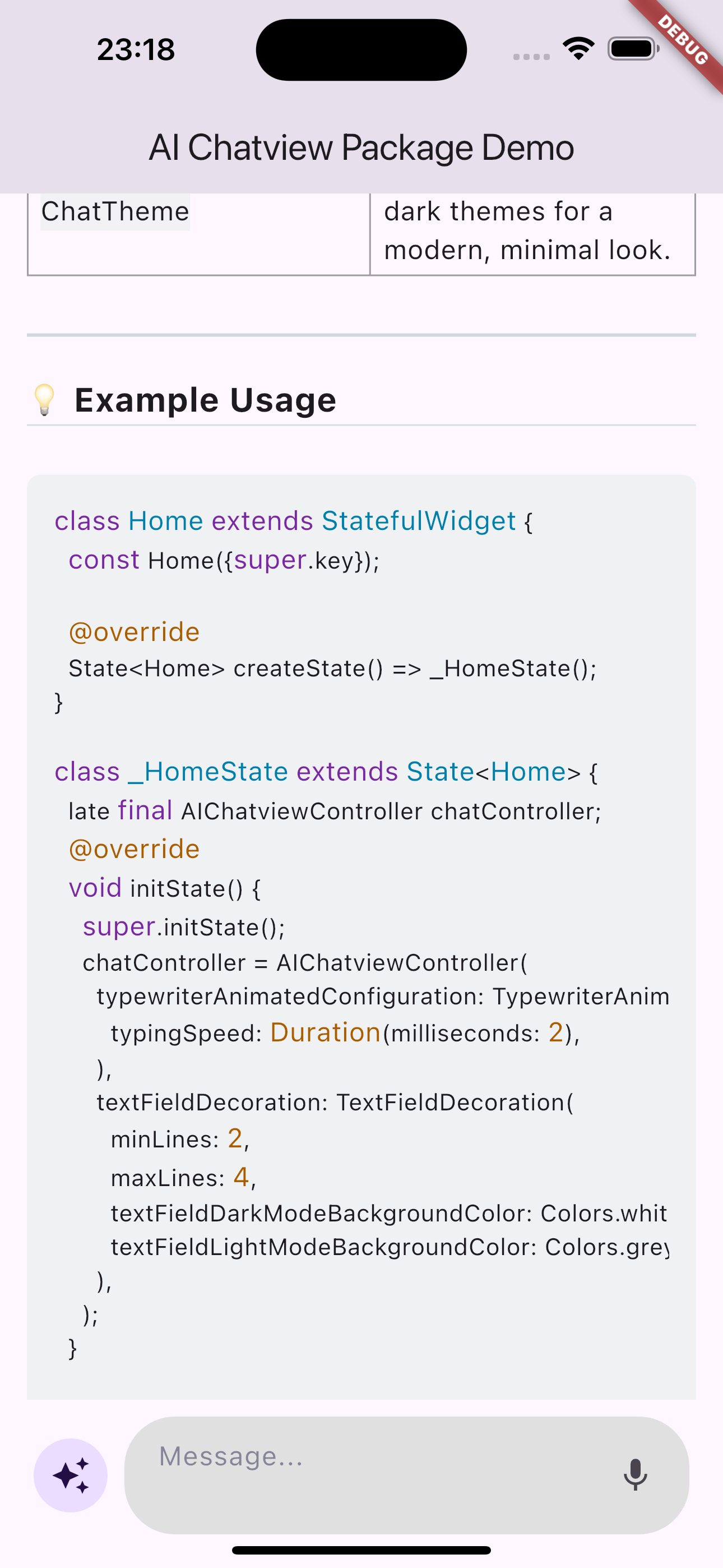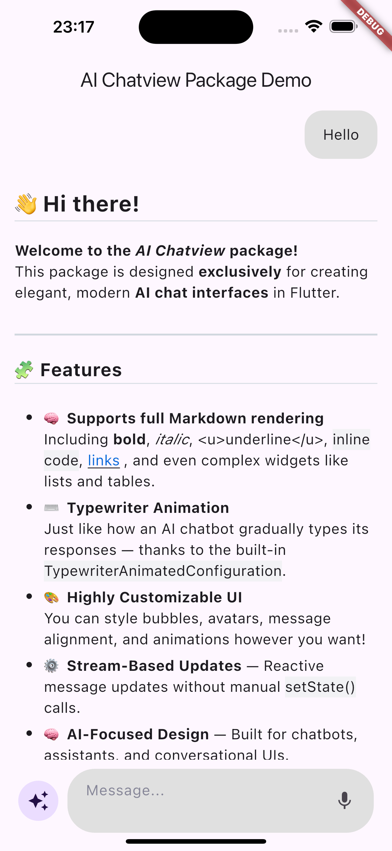 AI Chatview a customizable Flutter chat UI for AI-driven conversations with markdown and typing effects. This package is designed exclusively for creating elegant, modern AI chat interfaces in Flutter.