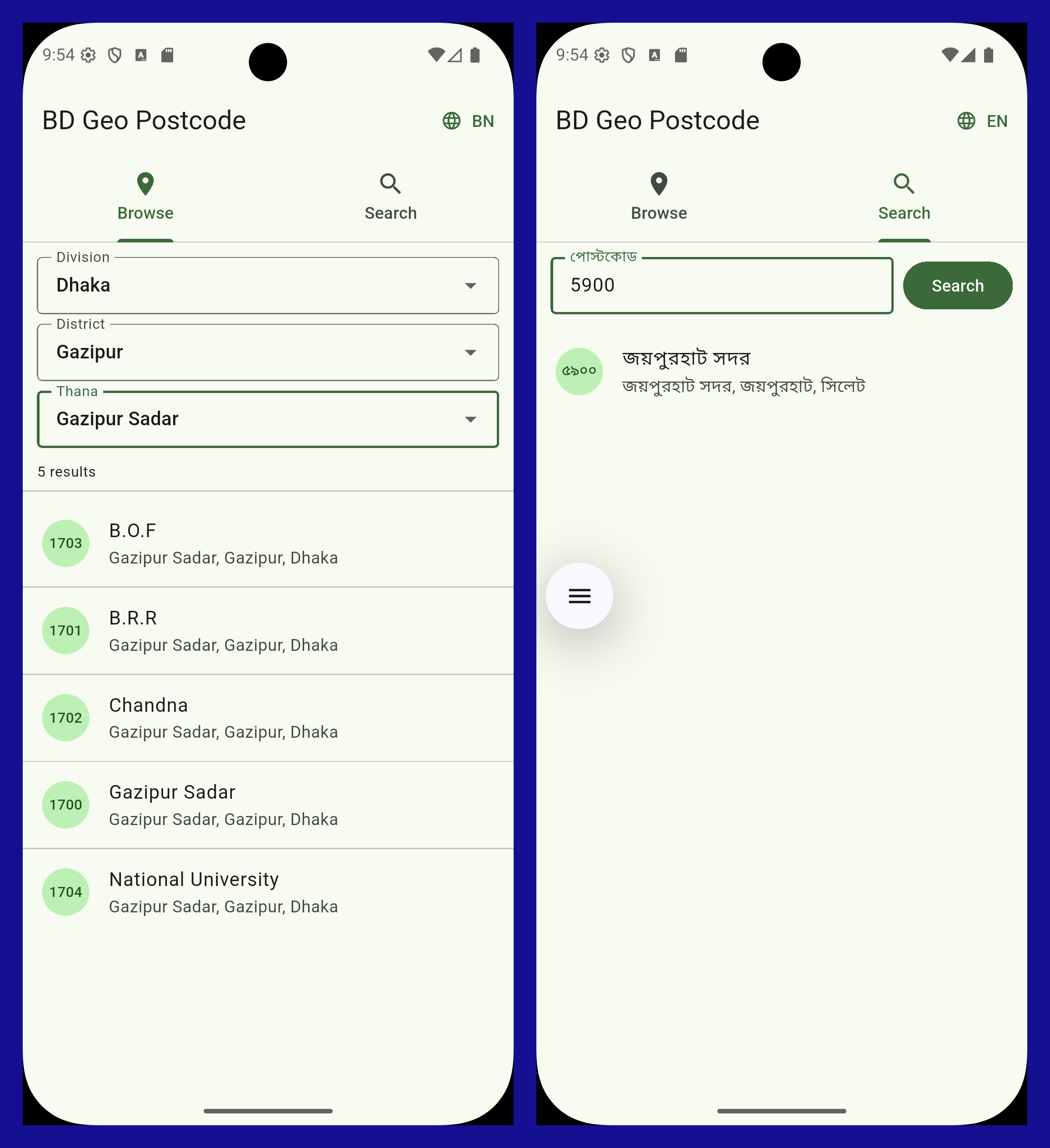 Offline Bangladesh geographic postcode lookup with Division, District, Thana and Postcode search. Supports Bangla and English. Uses Protocol Buffers for fast loading.