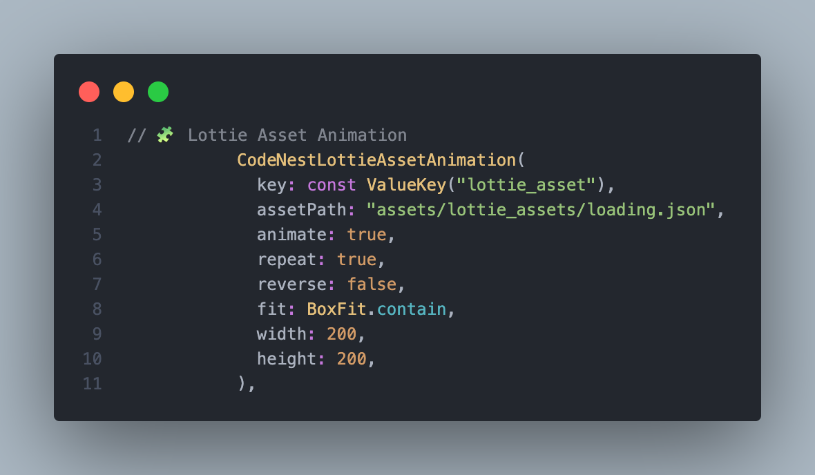 code_nest_ui includes pre-configured animation widgets using Lottie to add beautiful, lightweight, vector-based animations to your Flutter app.