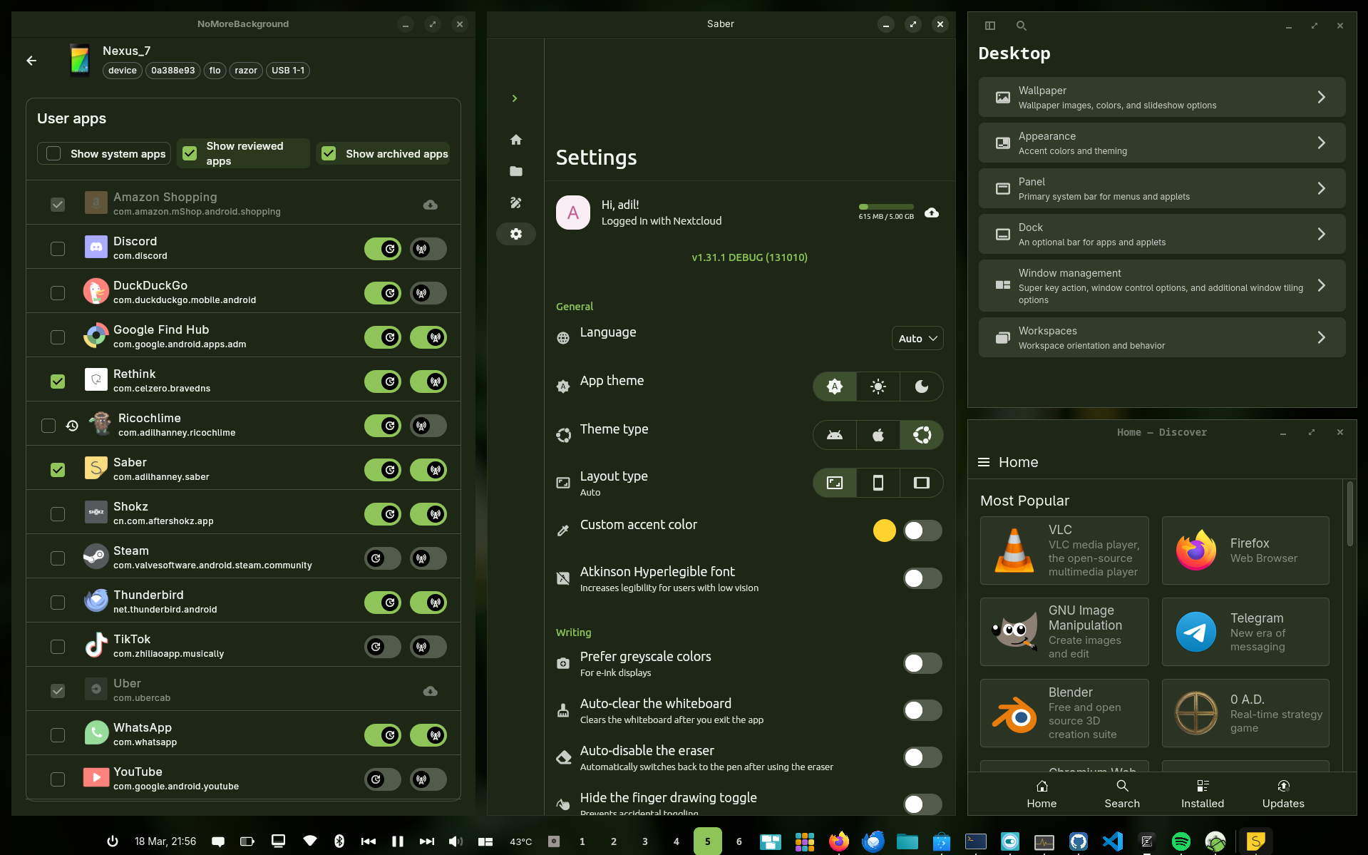 For example, here are my Flutter apps Saber and NoMoreBackground responding to the ambient dark green theme: