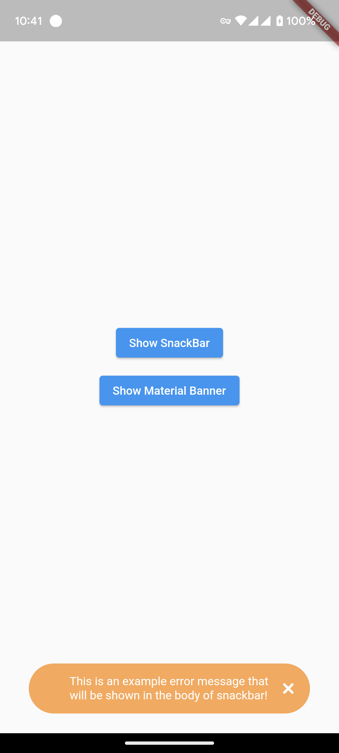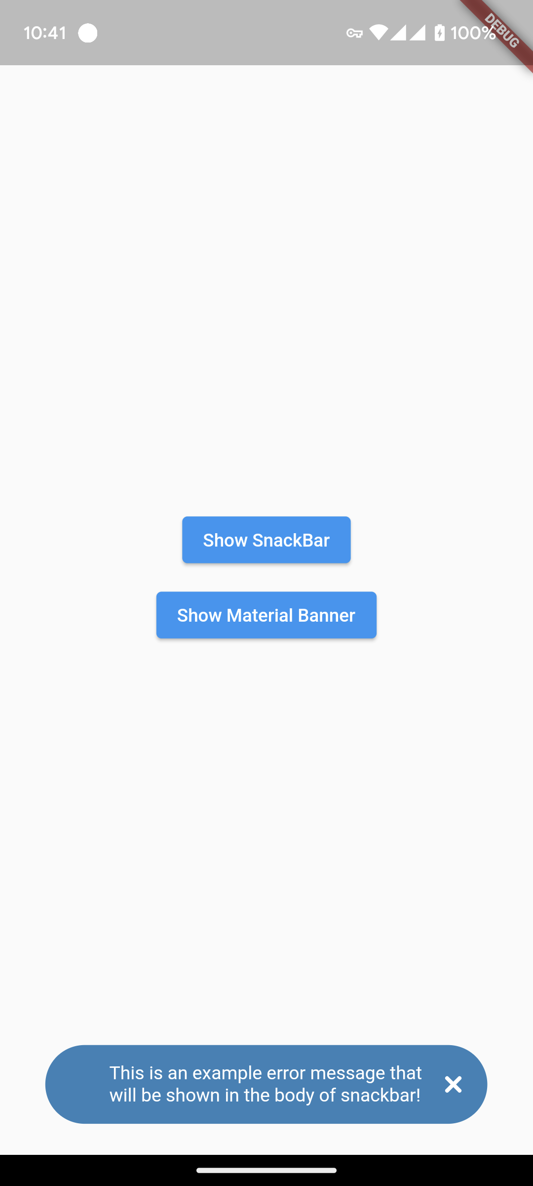 title: Top label that will be shown in the bodymessage: Body message reflecting some error message, success message etc.color: Color of SnackBar bodycontentType: ContentType class reflecting failure, success, help or warning.inMaterialBanner: Simply configure the working according toshowMaterialBanner